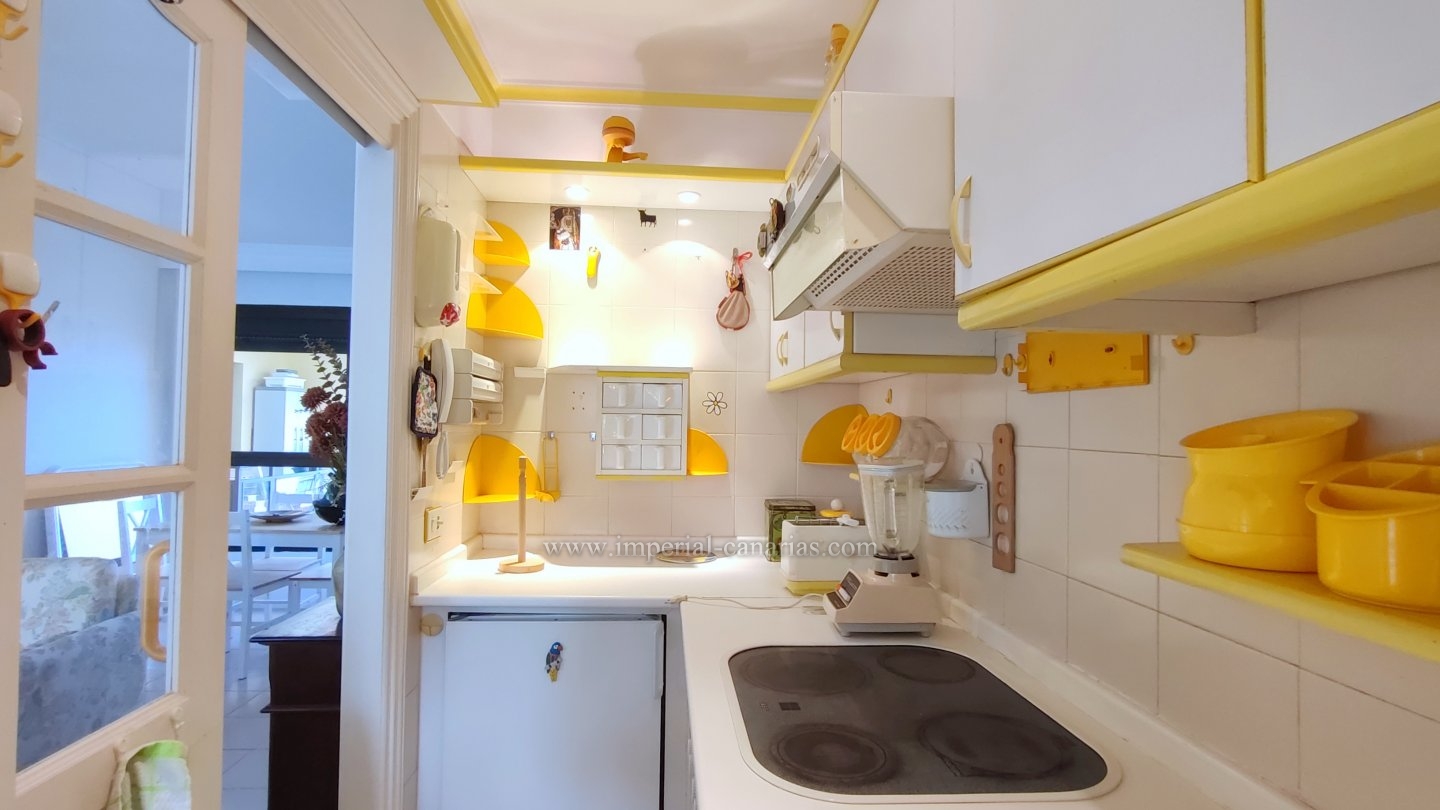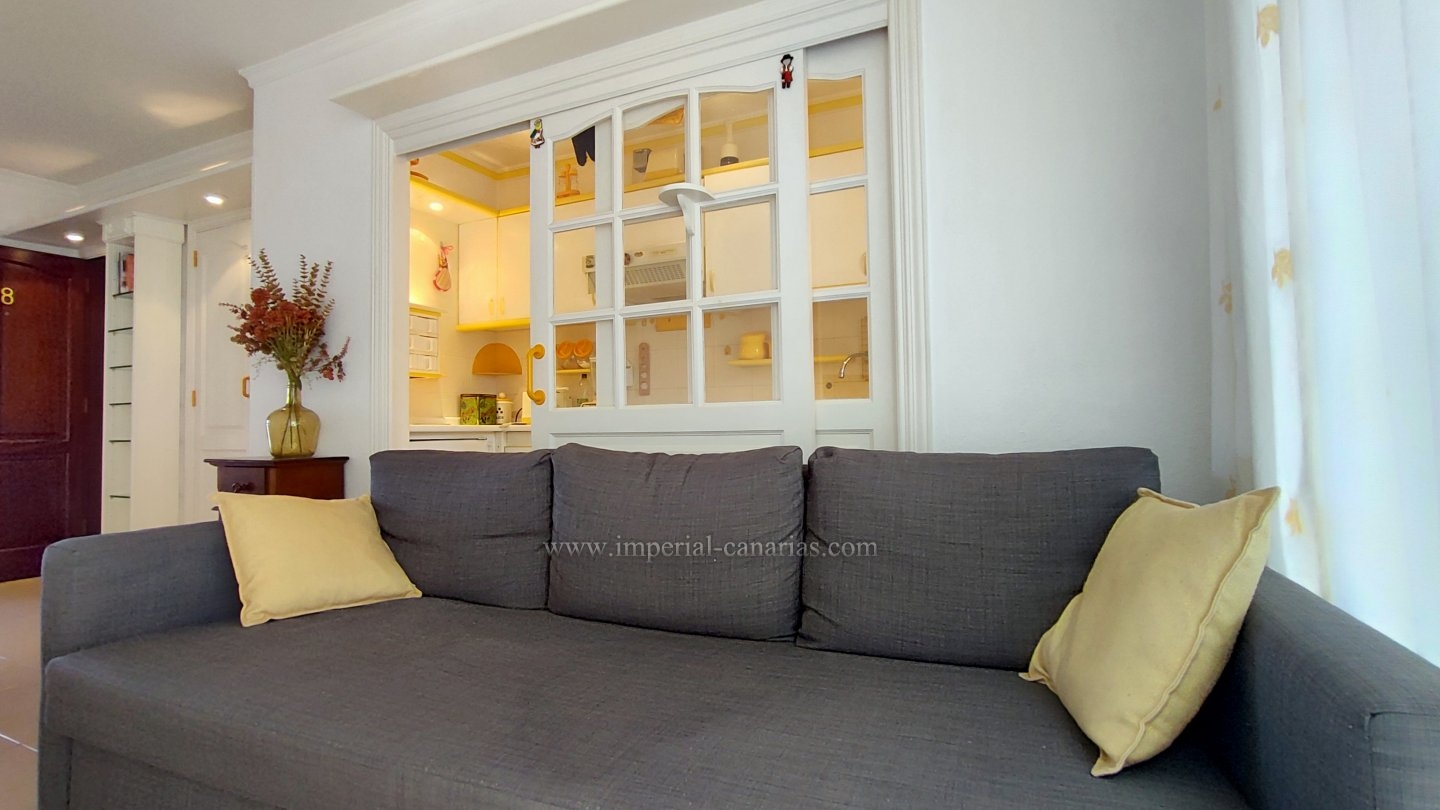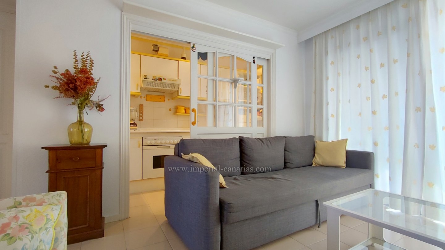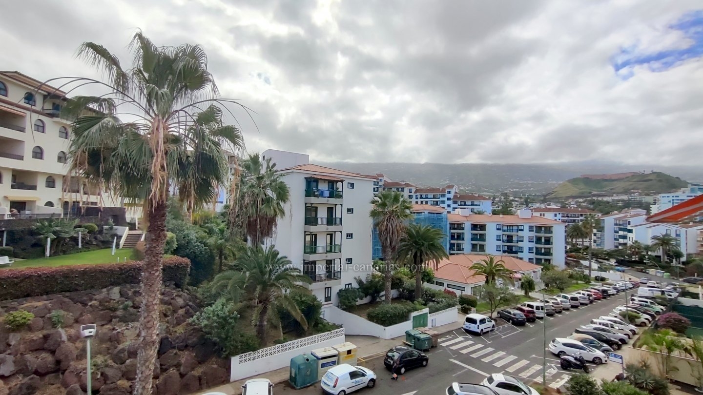 | Se alquila confortable y coqueto apartamento amueblado y de un dormitorio en la zona del Botánico, en Puerto de La Cruz. Se alquila tanto larga temporada como para corta. La vivienda se encuentra en la tercera planta de uno de los bloques del edificio y se puede disfrutar de la refrescante piscina y del jardín comunitario cuidado con esmero. El apartamento dispone de una espaciosa terraza de doce cuadrados, provista de mini-cocina exterior para comer al aire libre, orientada al sur y debido a ello, el apartamento es soleado y luminoso. Habitaciones exteriores todas ellas. Vistas a la ciudad, el Teide, las montañas y también hacia la piscina, los jardines comunes y el mar. Está completamente amueblado, y equipado. Se compone de salón comedor desde el que se accede tanto a a la cocina separada mediante puerta corrediza como hacia la acogedora terraza. Dispone de un espacioso dormitorio matrimonial con armario empotrado. Baño provisto de ducha. Edificio apto para personas con movilidad reducida. Plaza de parking en garaje comunitario en la parte baja del propio edificio e incluido en el precio del alquiler mensual. Gastos de suministro aparte. Coche prescindible debido a la proximidad de los comercios y buena conexión con el transporte público. |