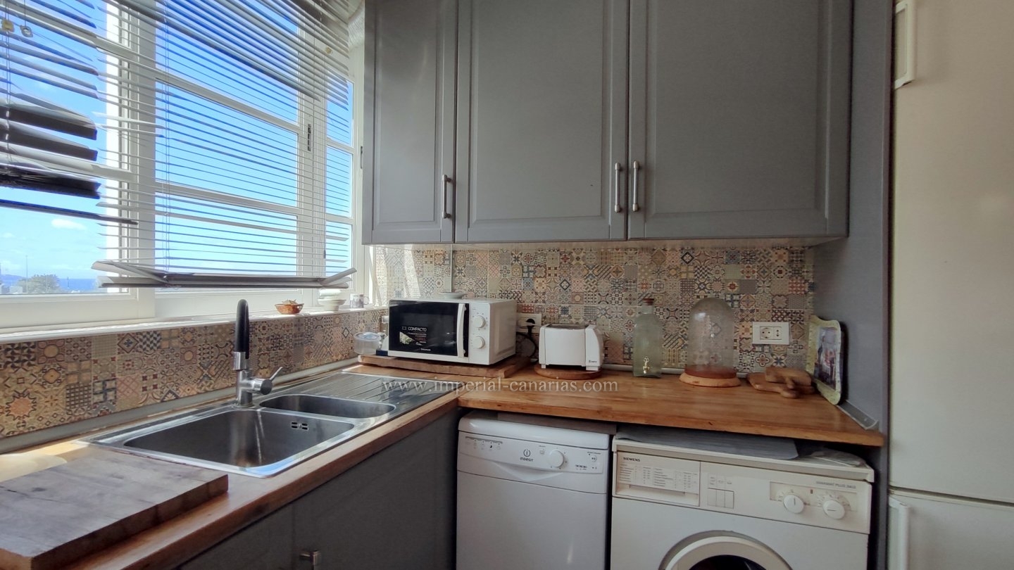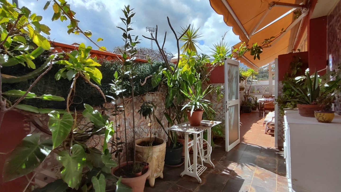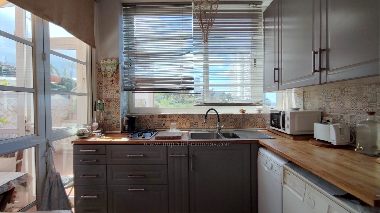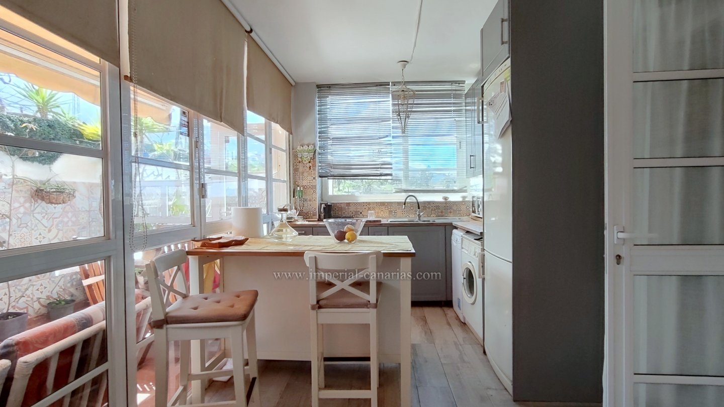 | Se alquila para larga temporada bonito y confortable apartamento en el distrito de Playa Jardín, en Puerto de La Cruz. Ha sido reformado. Dispone de varias terrazas delimitadas con varios ambientes, jardín, zona chill out, con mobiliario de exterior y toldo para los calurosos días y zona de barbacoa con vistas al mar y al Teide. La vivienda se compone de una acogedora terraza interior a modo de jardín de invierno situado justo en el hall a modo de bienvenida. El salón, el comedor y la cocina están integrados en la misma estancia, lo que lo hace todo muy hogareño y práctico. Dispone de un dormitorio matrimonial muy amplio con un gigantesco armario empotrado y un glamuroso tocador. Baño en suite provisto de ducha. Todas las habitaciones son exteriores. El apartamento se alquila amueblado y equipado. Los gastos de suministro no están incluidos en el precio del alquiler mensual. El wifi es gratuito. Zona tranquila, cerca de la playa, un paraíso. Apto para personas con movilidad reducida. Ideal para una o dos personas. No dispone de garaje pero hay abundante parking exterior por la zona. Negocios a proximidad. |